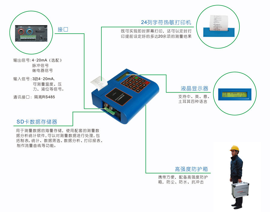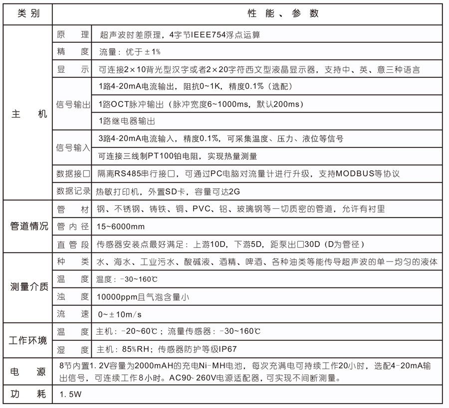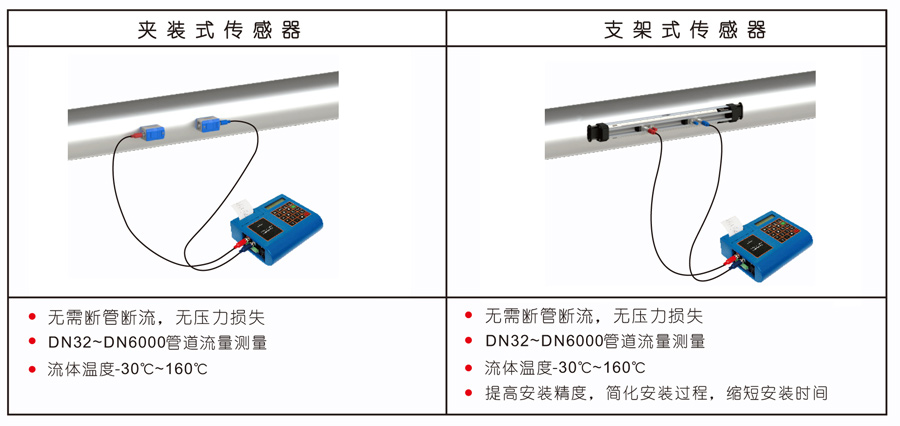 便攜式超聲波流量計(jì)實(shí)現(xiàn)了液體流量的非接觸式測(cè)量。將傳感器安裝在管道外壁,即可完成對(duì)流量的測(cè)量,方便準(zhǔn)確。內(nèi)置打印機(jī)和SD卡存儲(chǔ)器,可即時(shí)或定時(shí)打印設(shè)定的測(cè)量值。